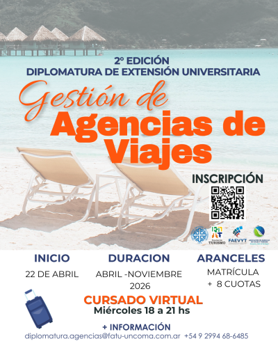 La Secretaría de Extensión de la Facultad de Turismo lanza la 2º Edición de la Diplomatura en Gestión de Agencias de Viajes, una propuesta de formación orientada a brindar herramientas prácticas y operativas para el desempeño en agencias de viajes y el sector turístico.