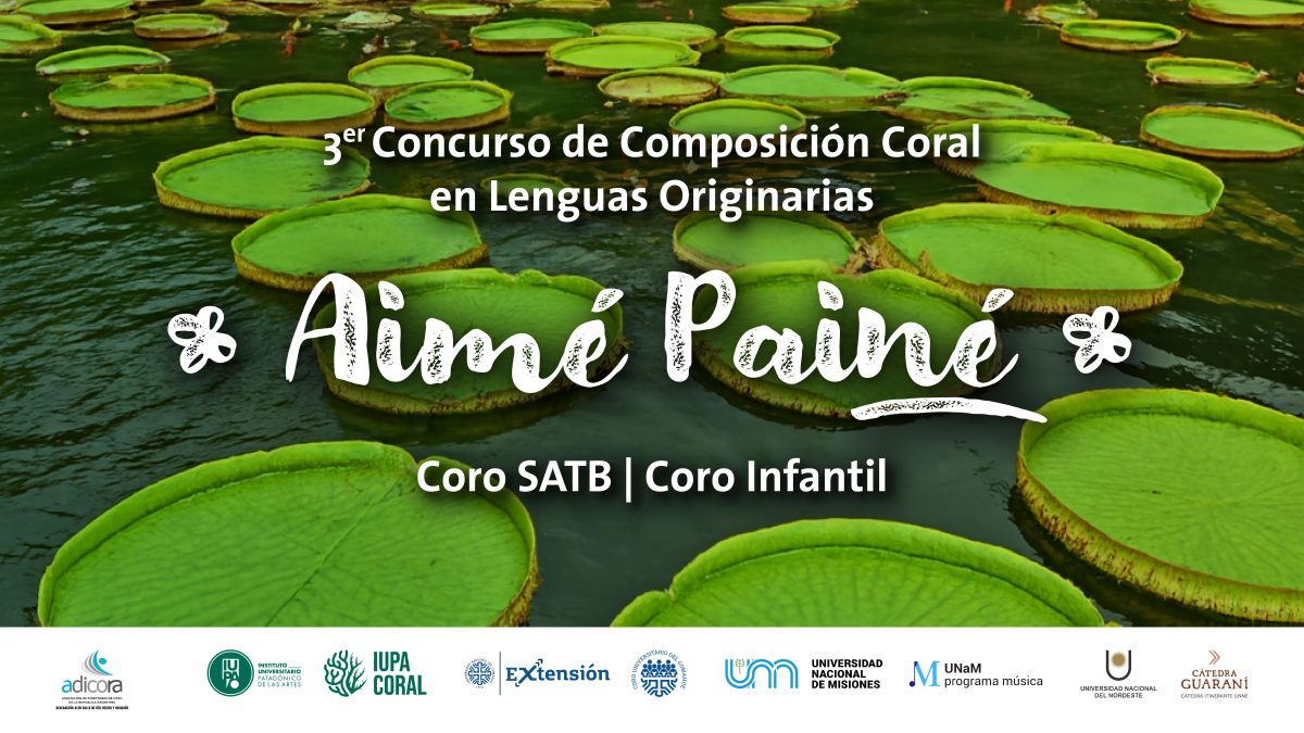 La Delegación Alto Valle de ADICORA (Asociación de Directores de Coro de la República Argentina) y la Mesa Coral Universitaria de Rio Negro y Neuquén, bajo el auspicio de la Secretaría de Extensión de la Universidad Nacional del Comahue, la Universidad Nacional de Misiones, la Universidad Nacional del Nordeste, del Instituto Universitario Patagónico de las Artes y de la ADICORA Nacional, convocan a compositorxs y arreglistas a presentarse al 3° Concurso de Composición Coral ‘Aimé Painé’, destinado a la creación de piezas inéditas a capella en base a textos en lenguas originarias.