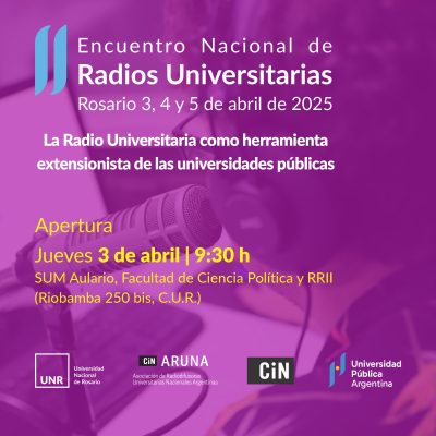 El evento se desarrollará en la sede de la Universidad Nacional de Rosario y su apertura estará a cargo de la Presidenta de ARUNA, Agustina Colucci, del Director Radio UNR, Lucas Del Chierico, del Vicerrector de la UNR, Darío Masía y la Decana de la Facultad de Ciencia Política y RR.II., Cintia Pinillos.
