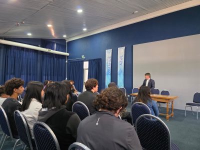 En la visita estuvieron acompañados por Luciana Silva (docente de ESI) y fueron recibidos por el Secretario de Extensión Damián Cancelo en el Salón Azul.